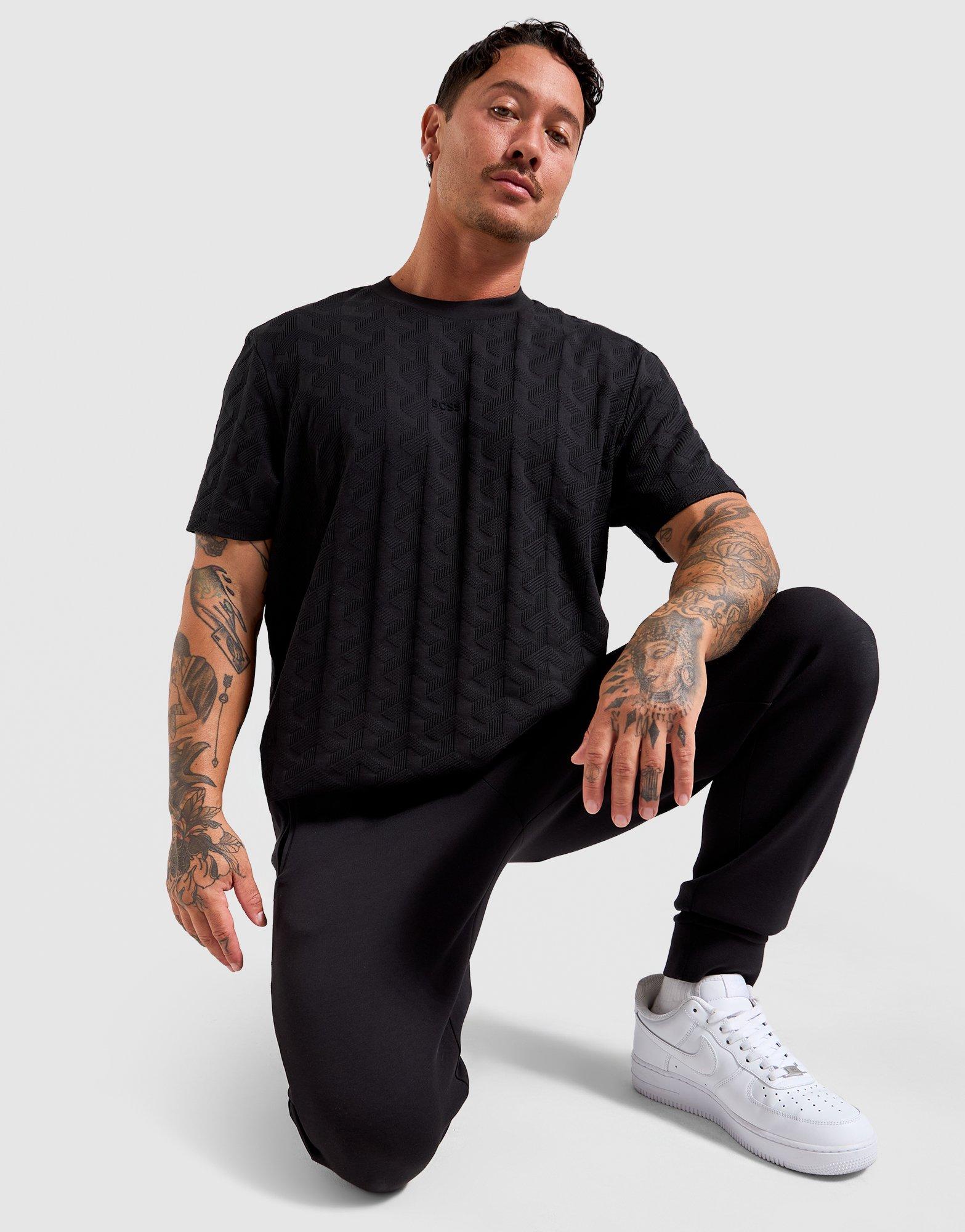 The BOSS AOP Geo Jacquard T-Shirt is one of the standout pieces in the men's BOSS tee range, using an all-over geometric jacquard construction to create a surface texture that looks high-end without any additional embellishment. The tonal black-on-black build is confident and considered, lending itself to both premium casual looks and smarter outfit combinations. Made from a quality cotton-blend fabric with a regular fit, this is the kind of men's BOSS T-shirt that elevates the simplest outfit with minimal effort.
