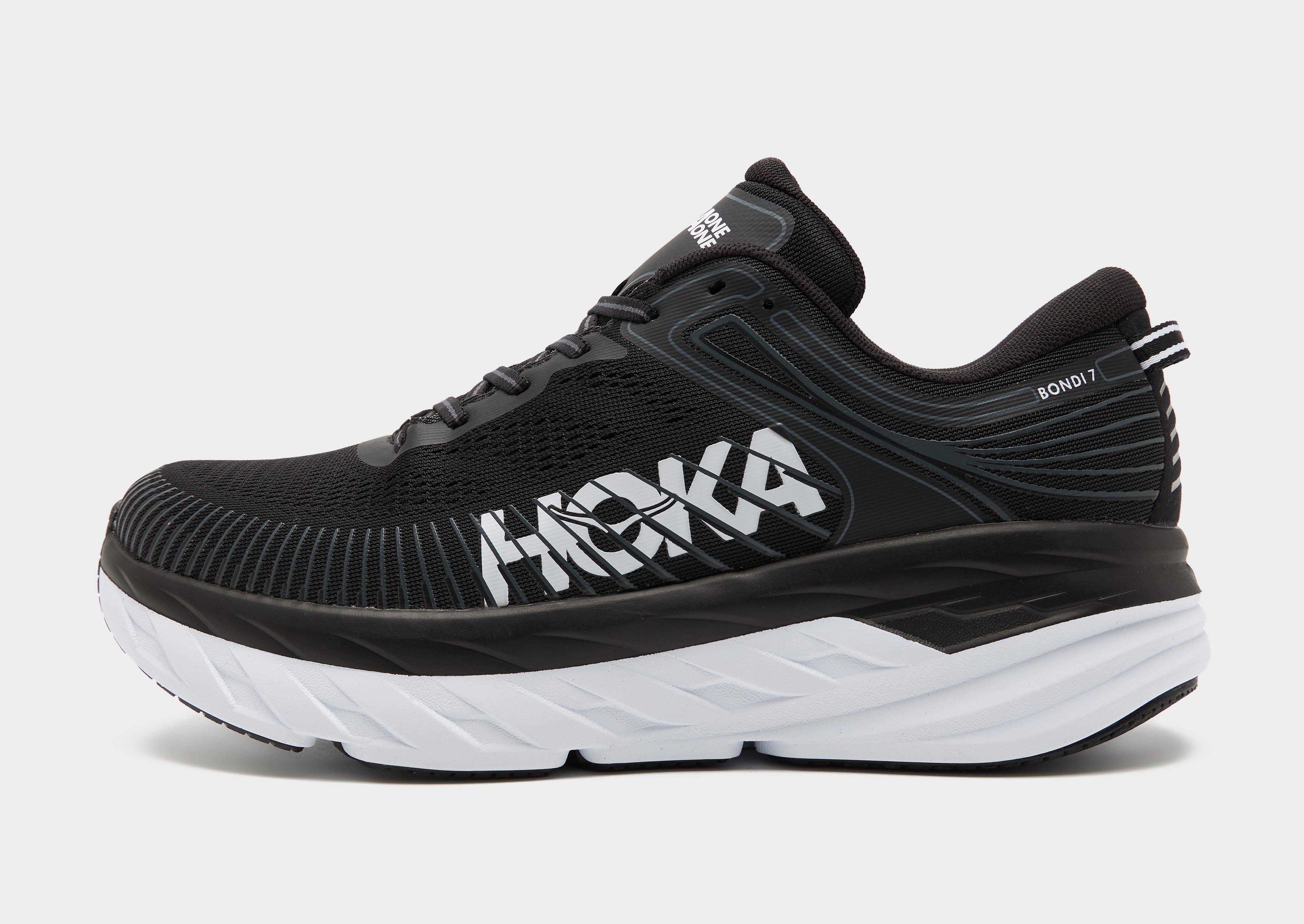 Make every mile count with these men's Bondi 7 running shoes from Hoka. In a Black colourway with White details, these runners are cut from light, breathable mesh in the upper that includes 50% recycled polyester. They feature a lace fastening to lock you in, with a padded collar for added support and an Ortholite sockliner for a snug fit. Underfoot, they sit on a chunky foam midsole for a smooth ride, with a grippy rubber outsole for traction. With heel tabs for easy on-and-off, they're finished up with classic Hoka branding. Style Code: 1110518-BWHT