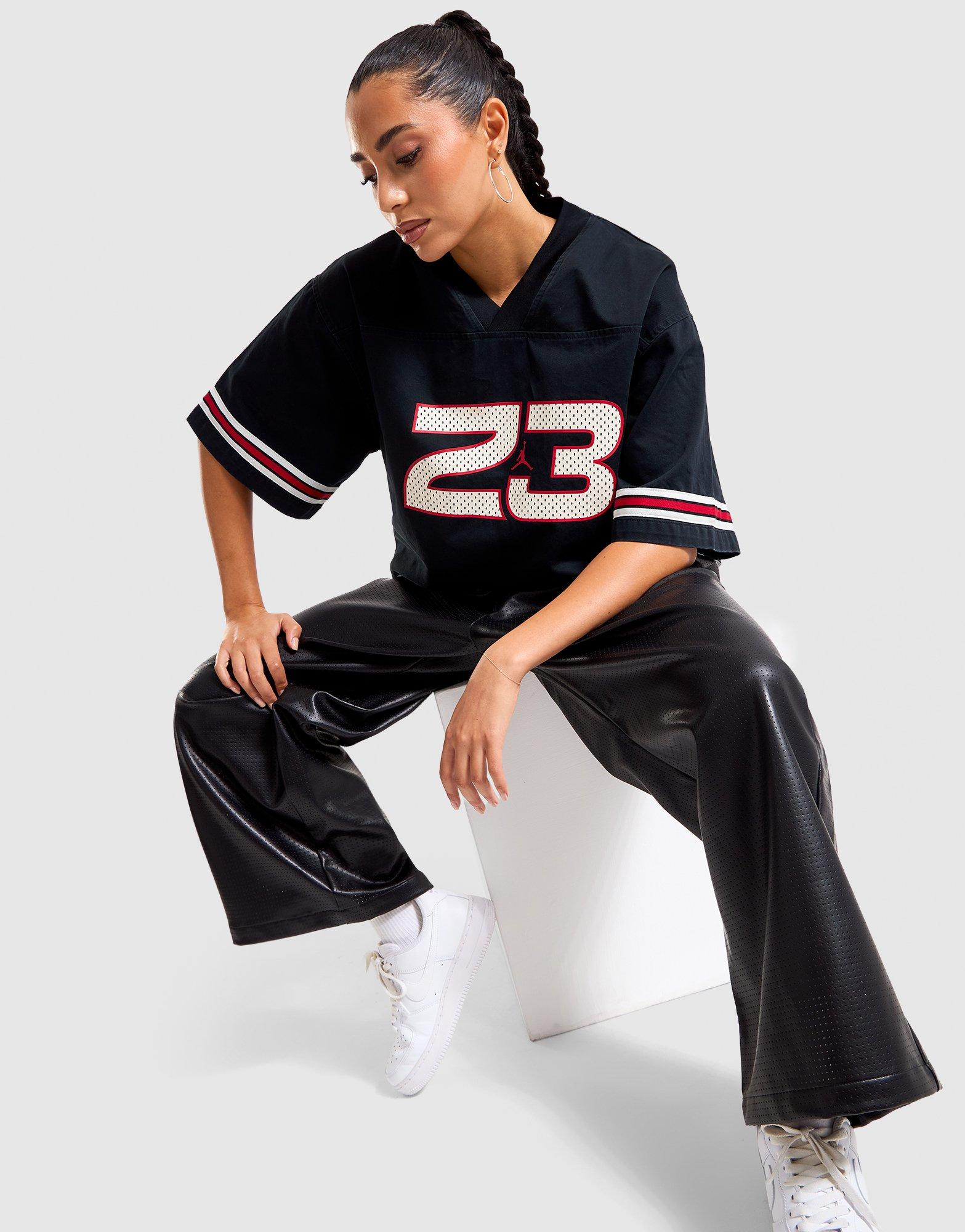 Make a statement with this women's Jordan V-Neck Oversized 23 Graphic Jersey Top. Featuring an oversized fit with v-neck styling and short sleeves, it showcases black with white and red 23 graphics for iconic Jordan heritage. The woven jersey construction delivers premium comfort with a relaxed silhouette that pairs perfectly with leggings or joggers. Built with Jordan quality and basketball-inspired branding, this top brings athletic edge to casual styling with distinctive oversized appeal. Perfect for creating laid-back looks with authentic Jumpman DNA. Style Code: IF1036-010