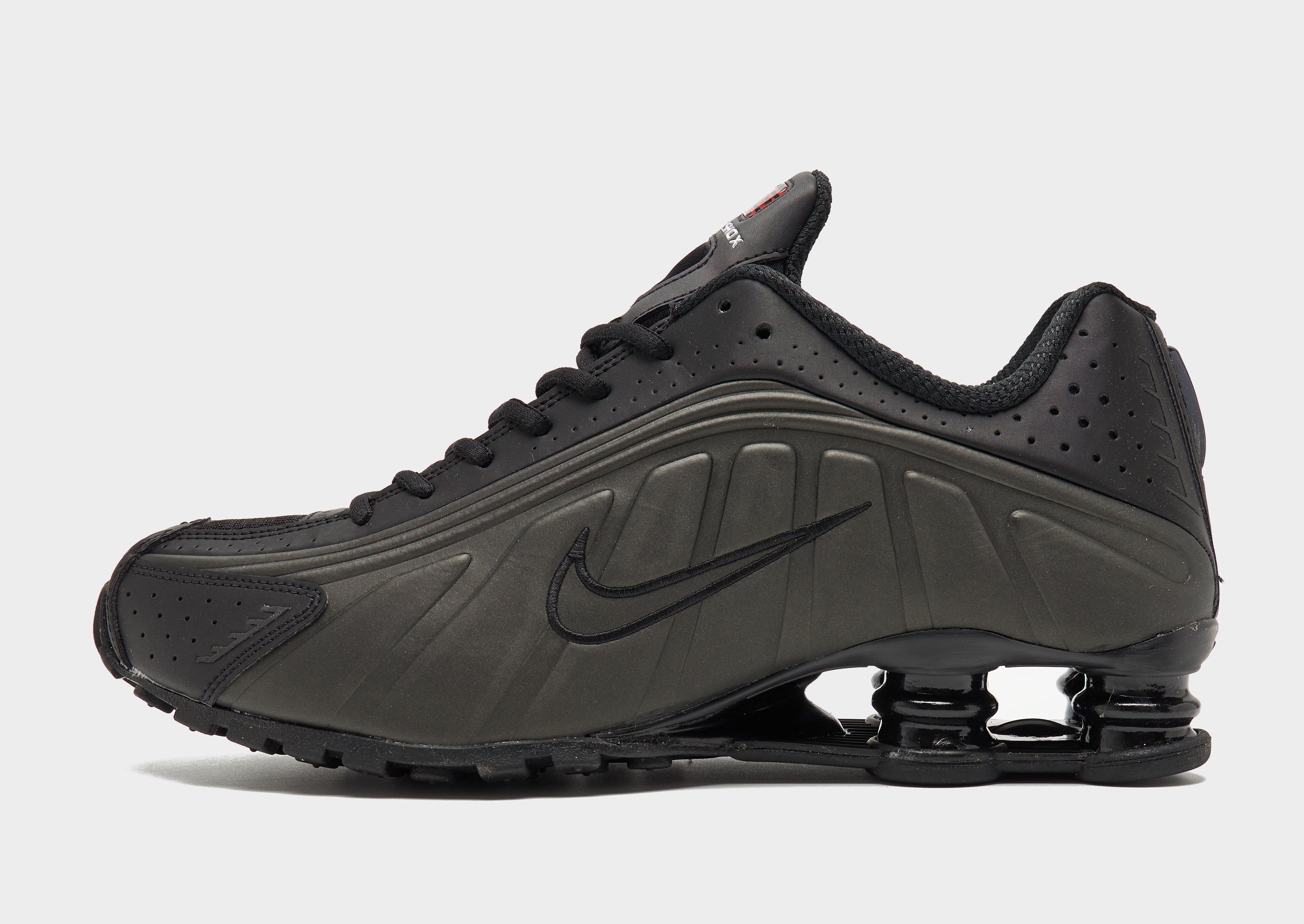 Retro but futuristic, these men's Shox R4 sneakers from Nike bring back the 2003 icon in its OG form. In a Black colourway with tonal details, these statement shoes are built with a breathable mesh upper that features glossy TPU overlays and a tonal lace up fastening for a locked-in fit. Nike's iconic Shox tech sits underfoot, with a full-length midsole of springy Shox columns for a super comfy feel. With a grippy rubber sole, these trainers are finished with Shox branding to the tongue and the signature Swoosh logo embroidered to the sidewalls. Style Code: HQ1988-001