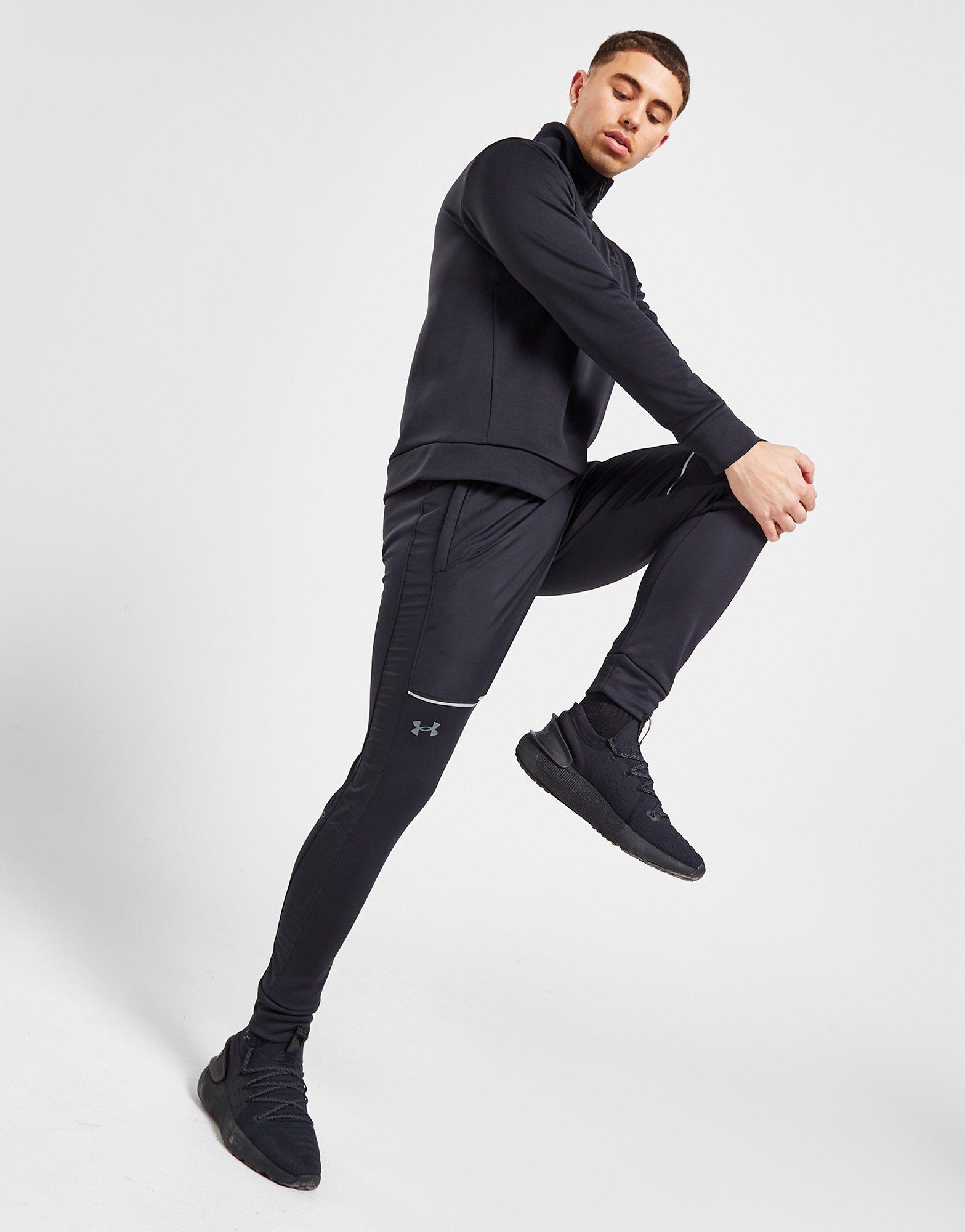 Stay covered from hikes to training sessions in these men's UA Armour Fleece Storm Track Pants from Under Armour. In a Black colourway, these streamlined pants are cut from smooth armour fleece poly fabric, with added stretch to keep them close. Equipped with Under Armour Storm tech for a breathable yet waterproof wear, they feature an elasticated waistband with an internal drawcord tie, as well as side pockets for your essentials. Finished up with reflective UA branding to the front and back of the right knee. Machine washable. | Our model is 5'11" and wears a size medium.