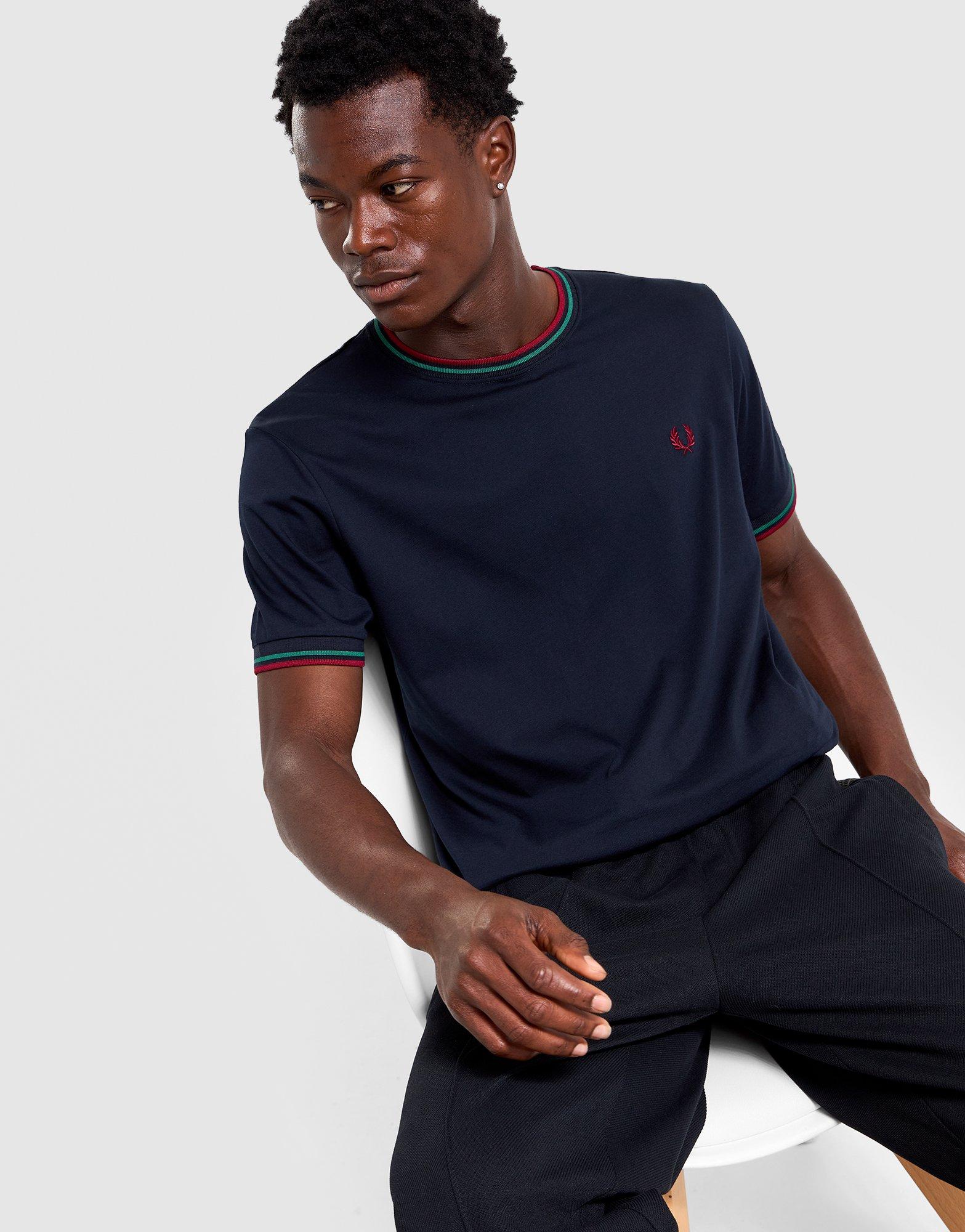 Keep it classic with this men's Fred Perry Twin Tip T-Shirt, delivering signature brand style in a versatile design. Built with a standard fit and short sleeves, it features the iconic twin tipping on a navy base with red and green accents. Made from comfortable fabric, this tee is perfect for everyday wear or pairing with Fred Perry track tops. A must-have piece for any heritage sportswear collection.