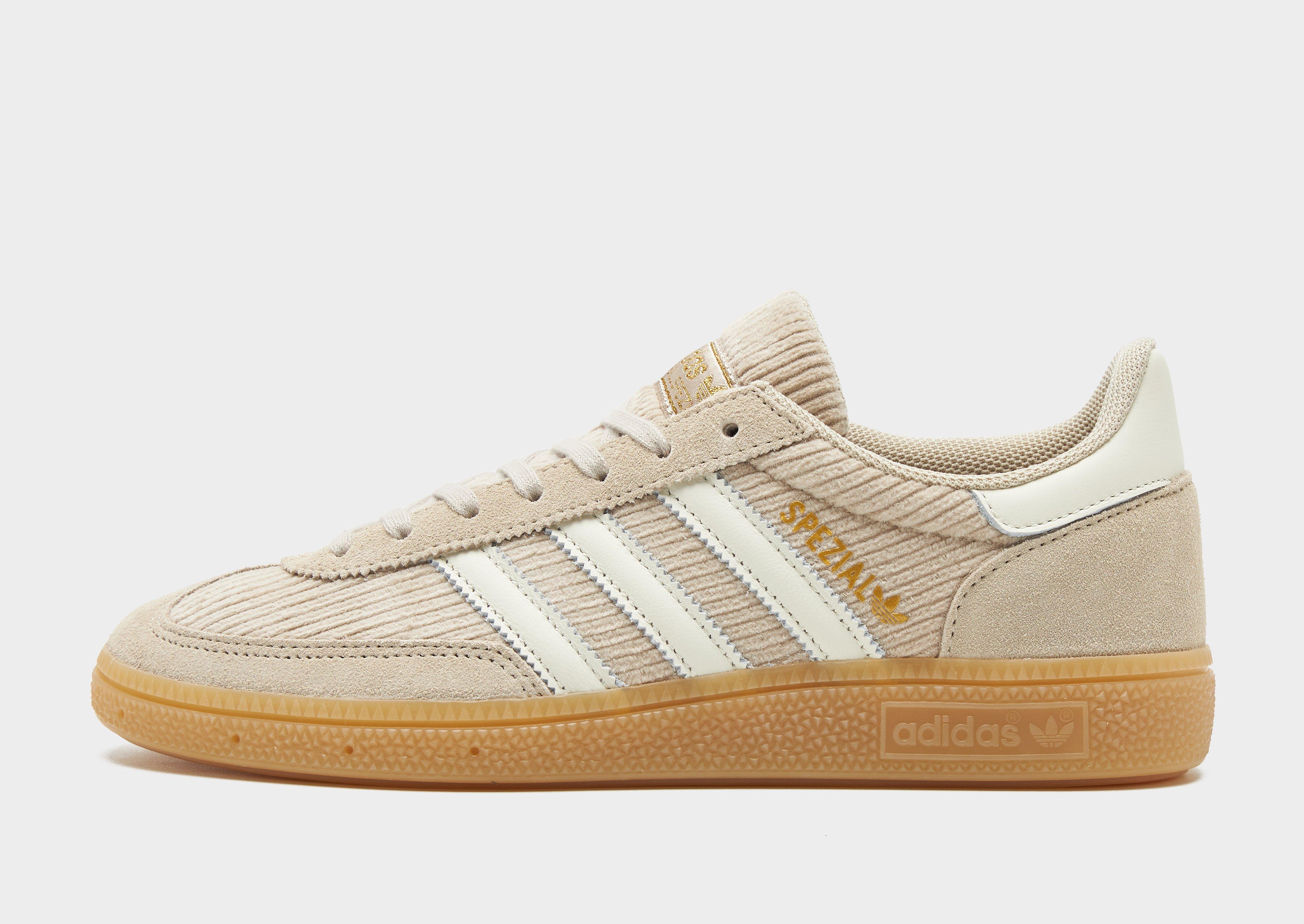 From the terrace to the street, rep a classic look with these women's Handball Spezial trainers from adidas Originals. Landing in a Cream colourway, these kicks have an upper made with cord for durable wear. They feature a lace fastening with a padded ankle collar for locked in fit and sit on a lightweight midsole. With a gum rubber outsole for total traction, they're signed off with the 3-Stripes to the sidewalls.