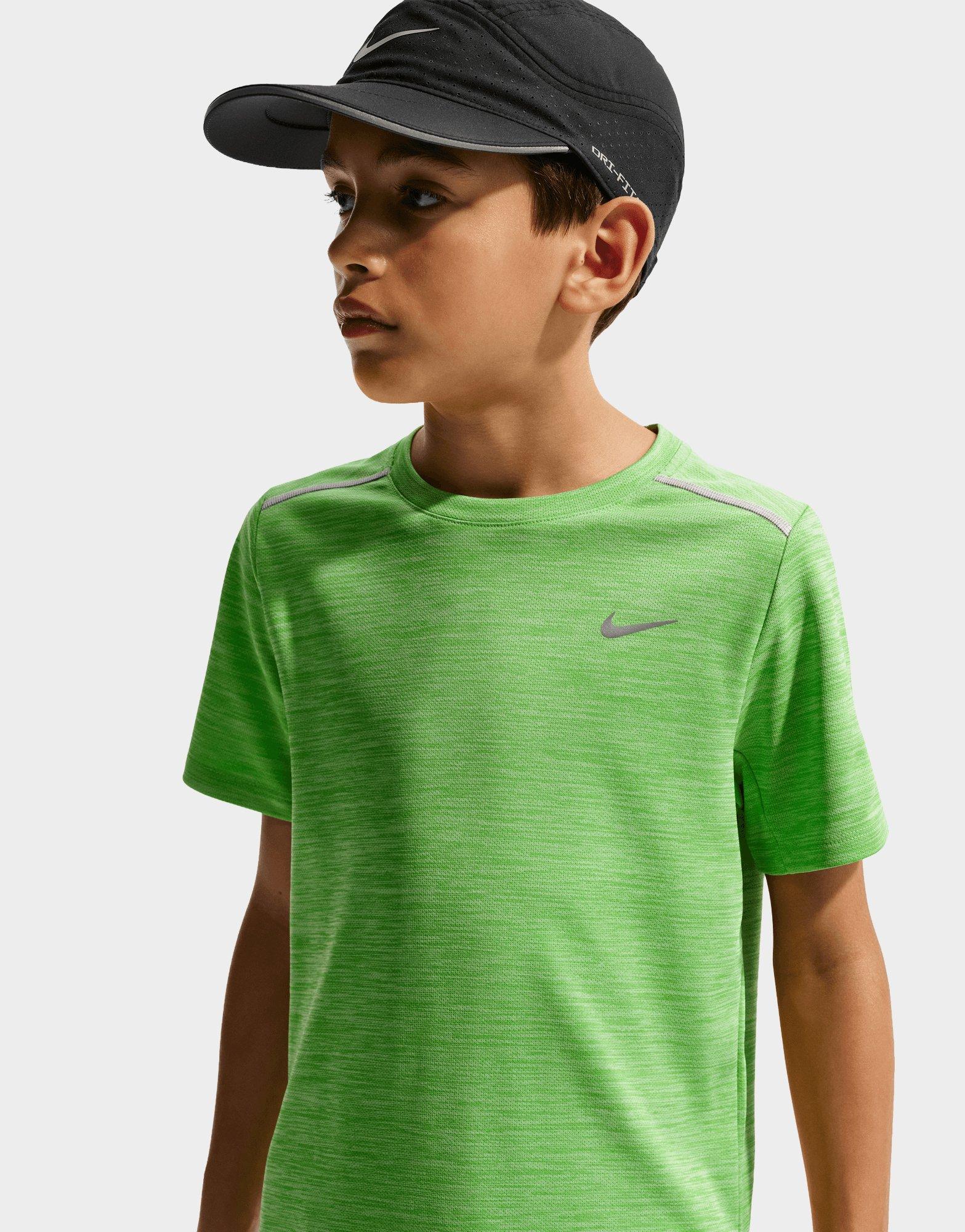 Keep him cool with this junior's Nike Miler T-Shirt. Designed with a standard fit and short sleeves, it features a vibrant lime colourway with silver accents for standout athletic style. The breathable construction makes it perfect for training, running, or active play. Built with Nike quality and eye-catching colour, this tee is a fresh addition to his sportswear rotation. Style Code: IF2425-360