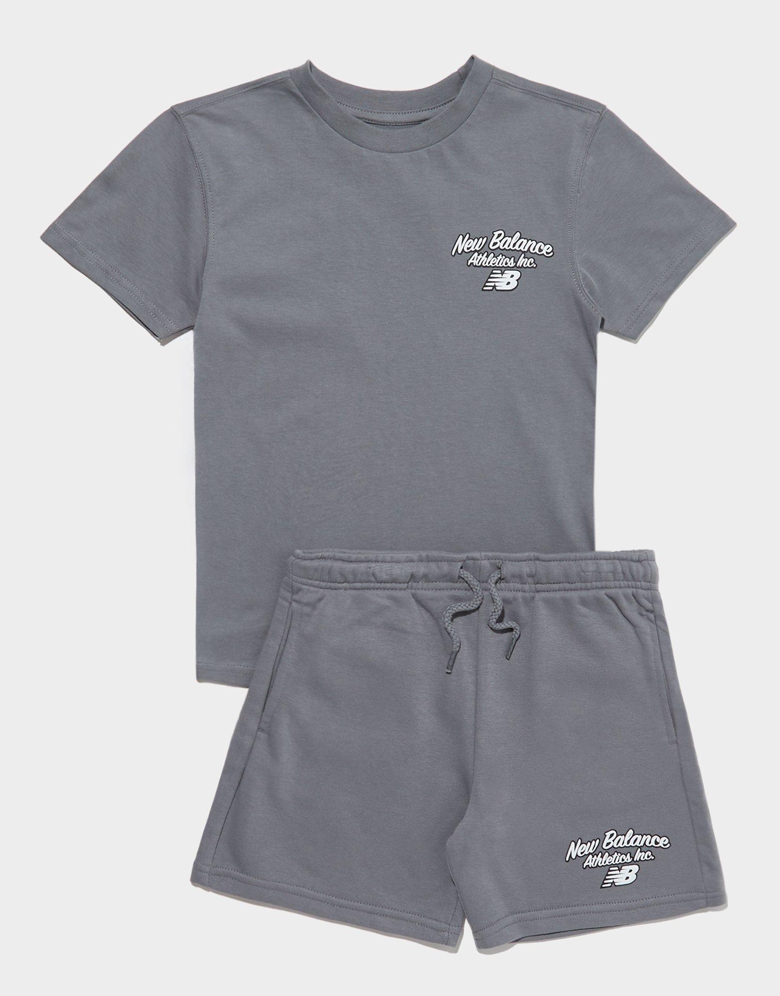 Exclusively at JD, the kids' New Balance Linear Graphics T-Shirt Set in Silver Grey with White is the matching two-piece outfit for young New Balance fans who want their casual look to feel as considered as their parents'. The set pairs a short-sleeve T-Shirt and coordinating bottoms in a clean Silver Grey colourway with White New Balance Linear Graphics branding, making it the practical, stylish everyday set that keeps kids looking fresh without any effort. Style Code: LAKB0566-YST