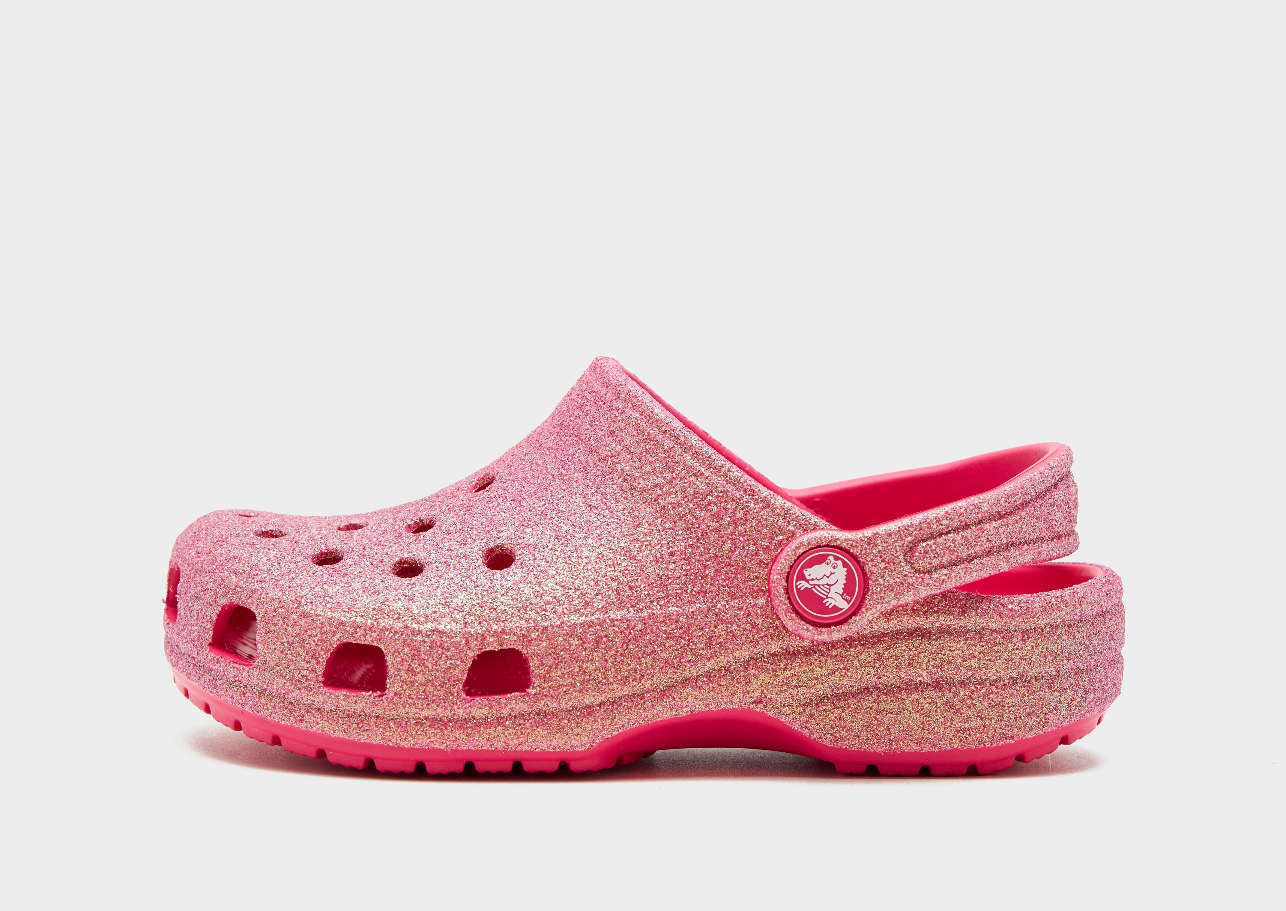 Add an iconic look to your footwear rotation with these children's Classic Clogs from Crocs. In a Glitter Dragonfruit Pink colourway, these clogs have a lightweight Croslite upper that has ventilation ports for breathability. They feature a soft footbed that offers responsive cushioning with every step, while the outsole keeps you gripped to the surface. Comfortable, simple, these clogs are easy to wear - just slip on and get going! Wear them around the house, to the shops, and pull the heel strap down to lock in. Style Code: 210986-6ZQ