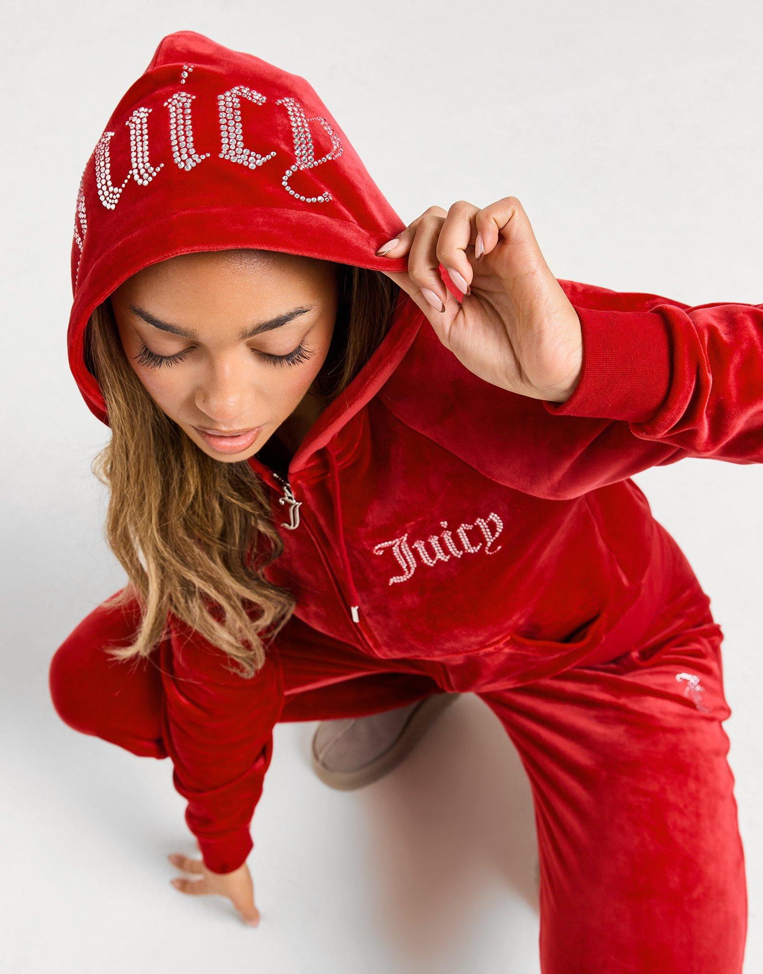 Bring the retro vibes on chill days with this women's Diamante Logo Velour Full Zip Hoodie from Juicy Couture. In a Cherry Red colourway, this JD-exclusive hoodie is cut from smooth velour fleece for total comfort. It features a full-zip fastening and adjustable hood for custom coverage, with ribbed trims to hold the shape and side pockets for easy storage. Finished up with signature diamante Juicy branding to the chest. Machine washable | Our model is 5'7" and wears a size small.