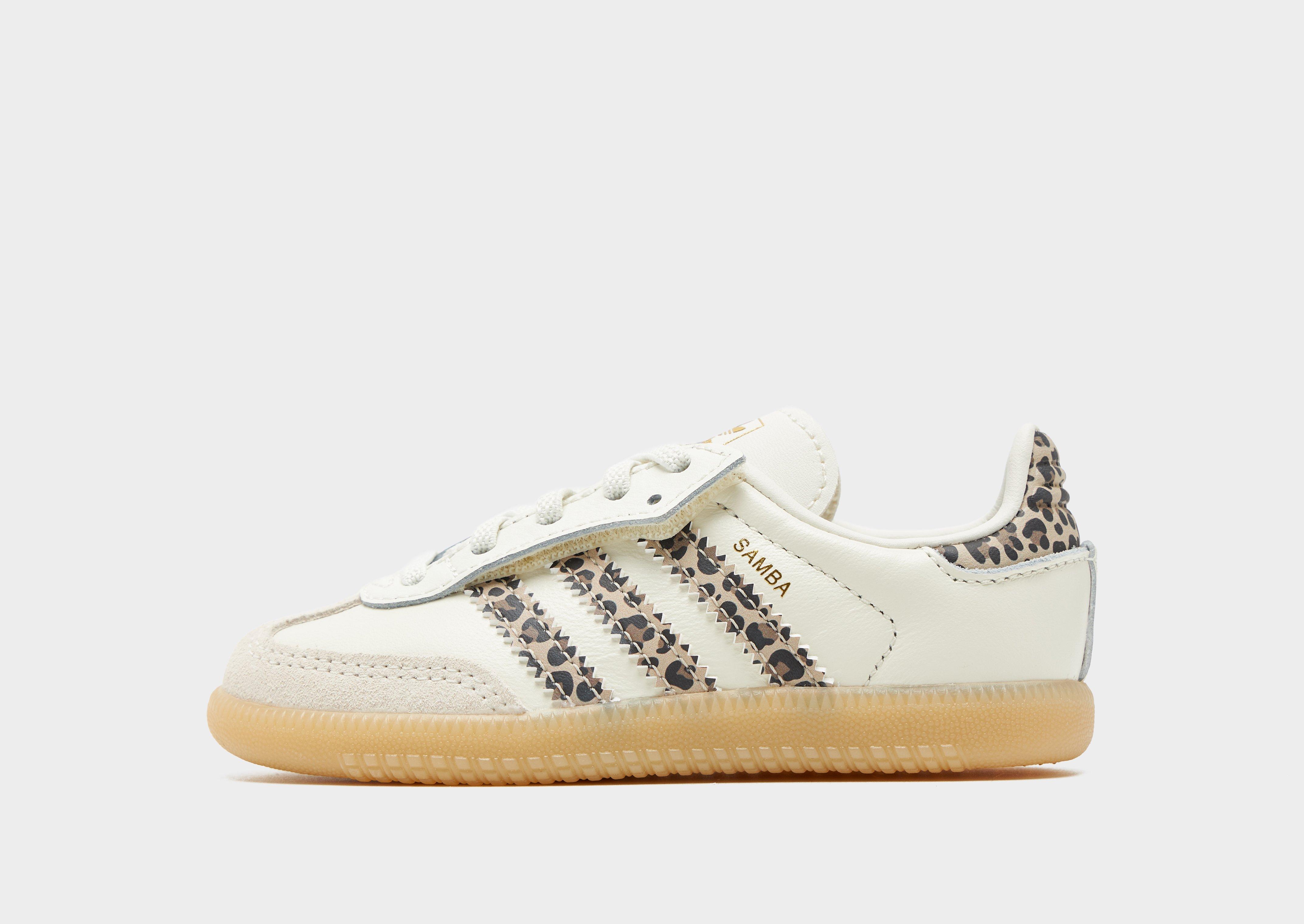 Give their first steps a classic look with these infants' Adidas Samba OG trainers, exclusive to JD. Originally built for indoor football, this scaled-down icon brings terrace style to everyday wear. The soft leather upper keeps little feet comfortable, while the timeless design makes them perfect for any outfit. Finished in an off white colourway with leopard print details and a gum sole, they deliver heritage style with a playful twist.