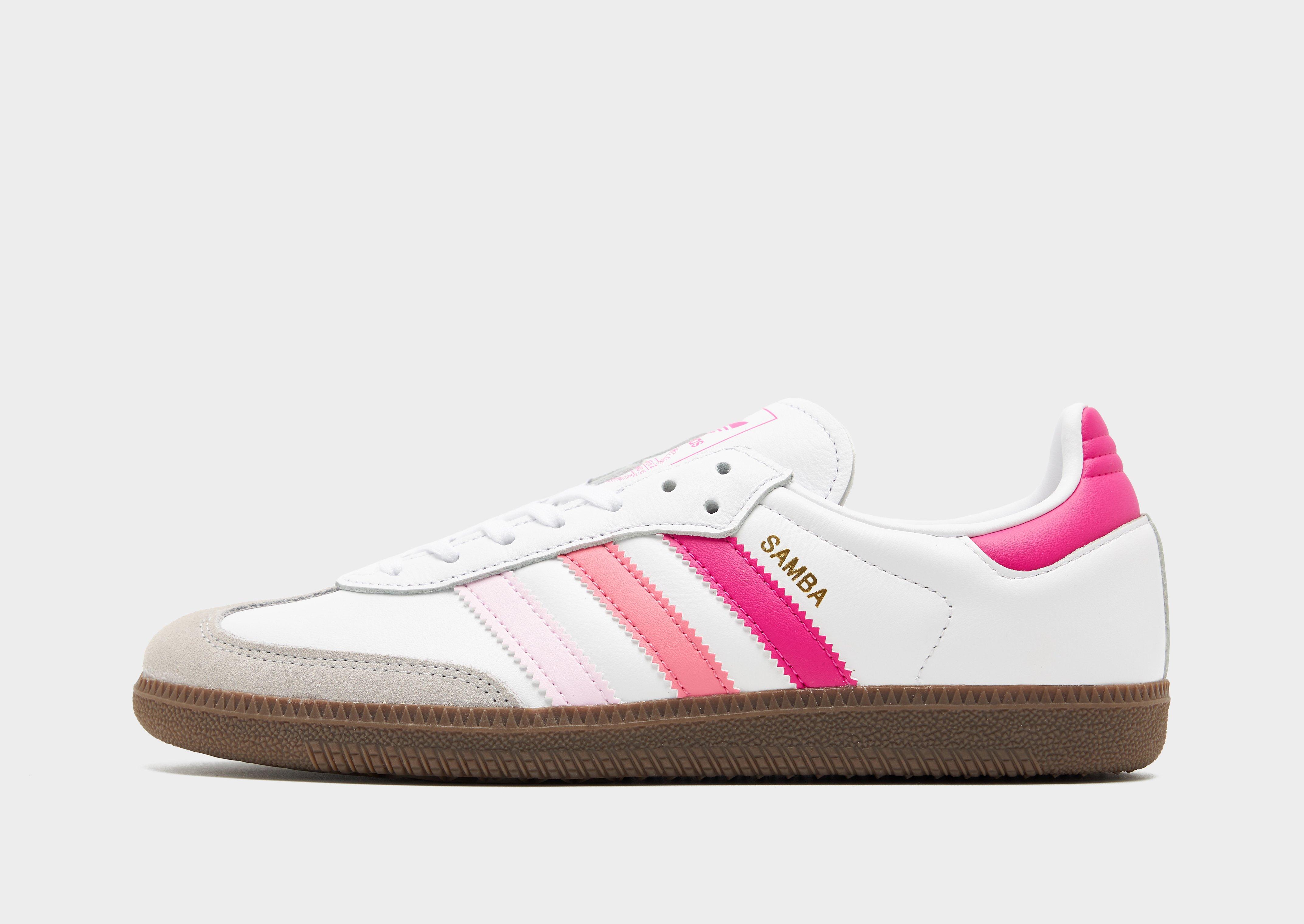 Add a streetwear icon to your footwear rotation with these junior's Samba OG shoes from adidas Originals. Taking cues from the original football-inspired Samba design first introduced in the 1950s, these iconic terrace sneakers let you imagine you're walking in those vintage footsteps. Built with a White leather upper, they feature a suede toe guard and are sat upon a responsive gum midsole. With tonal laces and signature adi 3-stripes to the side in Pink, they're signed off with 'Samba' wording to the side, and iconic Trefoil branding to the tongue. Style Code: JP5492