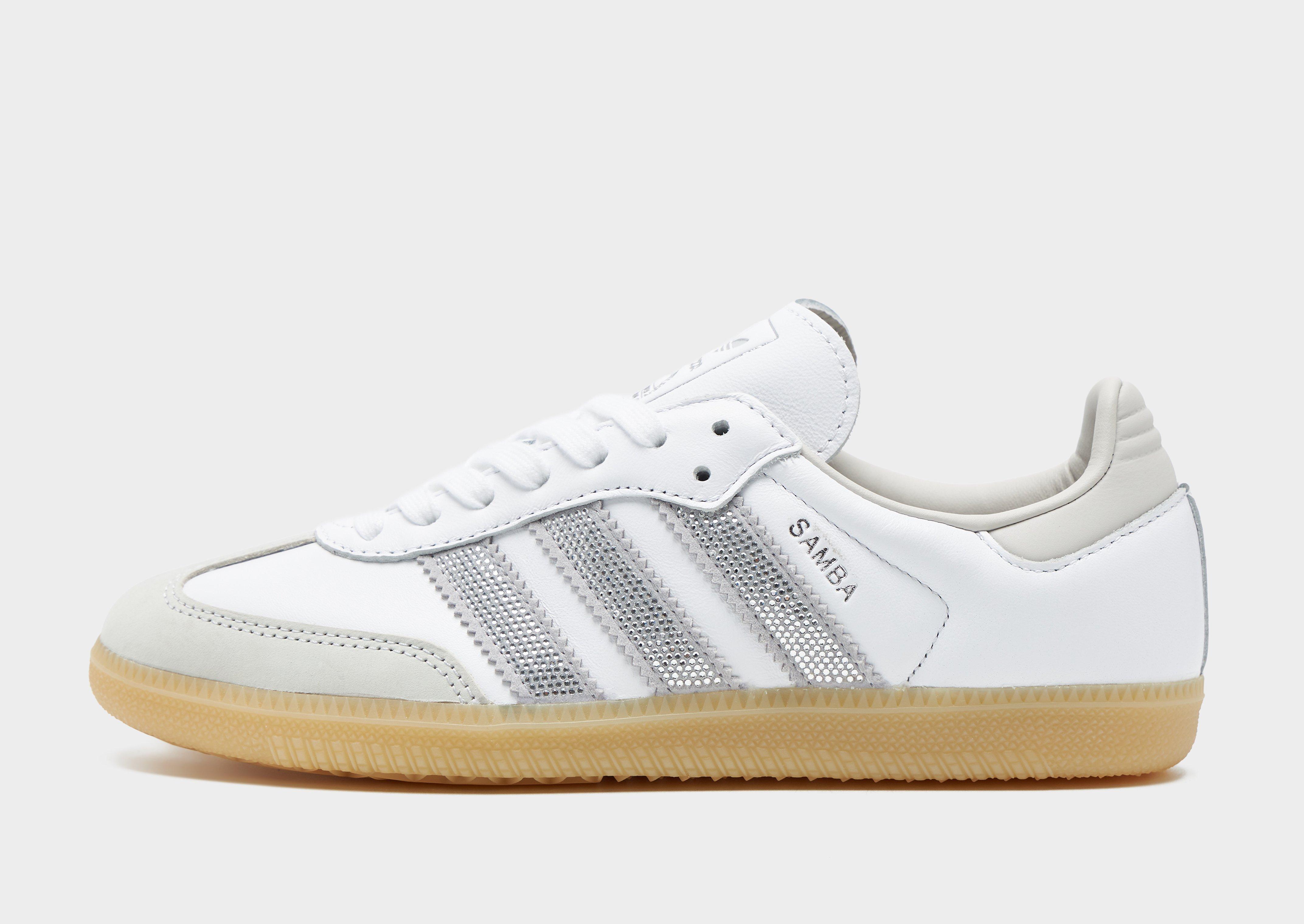 Make it shimmer in these Women's Adidas Samba OG. Landing in white, silver, and diamante, these sneakers are the most premium expression of the iconic football terrace silhouette yet. The silver and diamante detailing elevates the classic Samba upper into genuine luxury territory, catching the light and turning heads with every step. The clean white base keeps it wearable and versatile, making these women's Adidas Samba shoes as at home at a dinner out as they are on the street. A collector's Samba for women who want the best. Style Code: KK0063