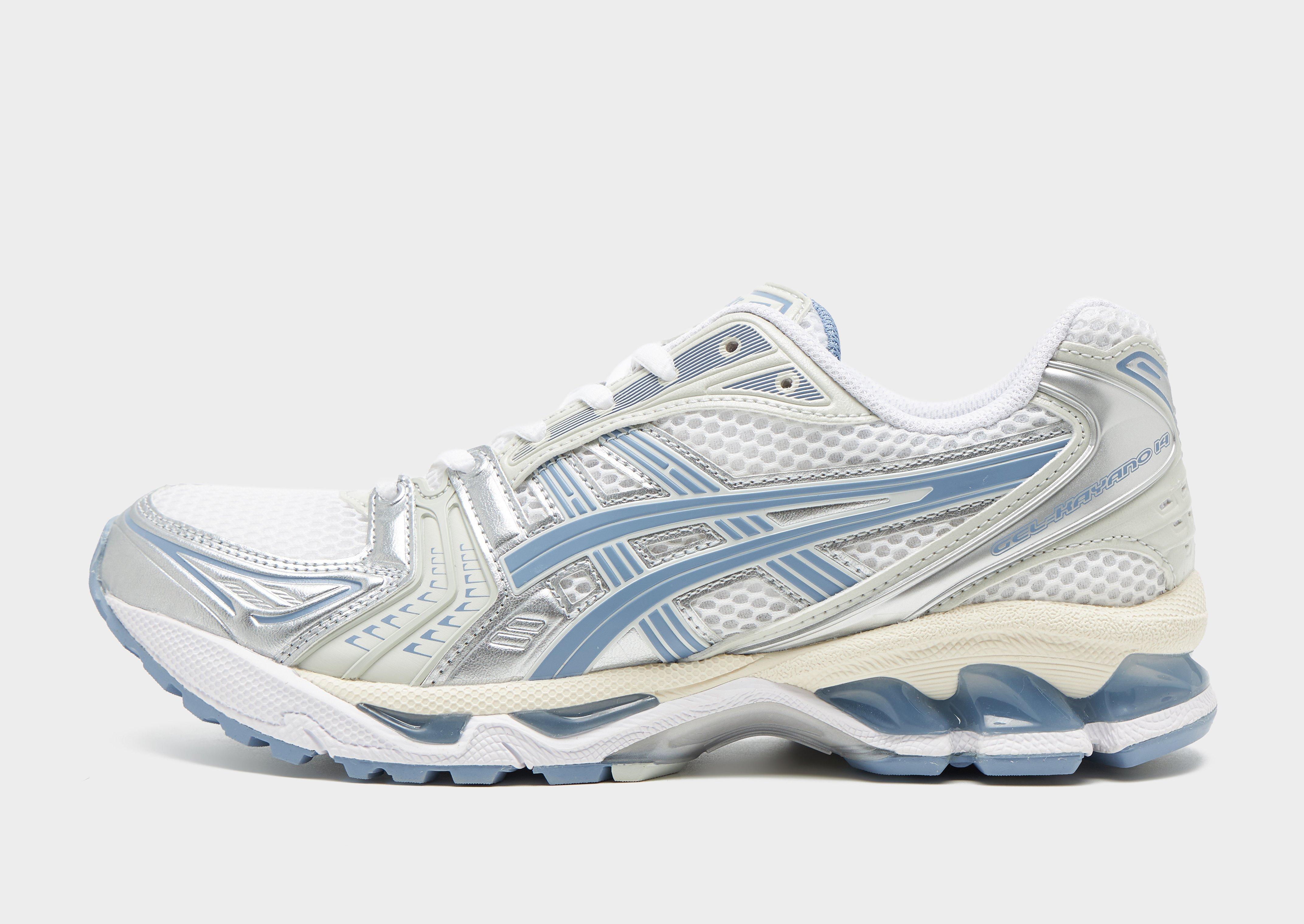 Get a vintage style with these women's GEL-KAYANO 14 shoes from ASICS. In a White colourway with Blue details, these low-profile sneakers have a breathable mesh upper with synthetic overlays for a supportive feel. They feature a lace fastening to lock you in, a padded ankle collar for a snug feel and a TRUSSTIC support system. Underfoot is a foam midsole coupled with GEL technology for next-level cushioning and a rubber outsole for traction. Signed off with ASICS branding throughout. Style Code: 1203A537.115W