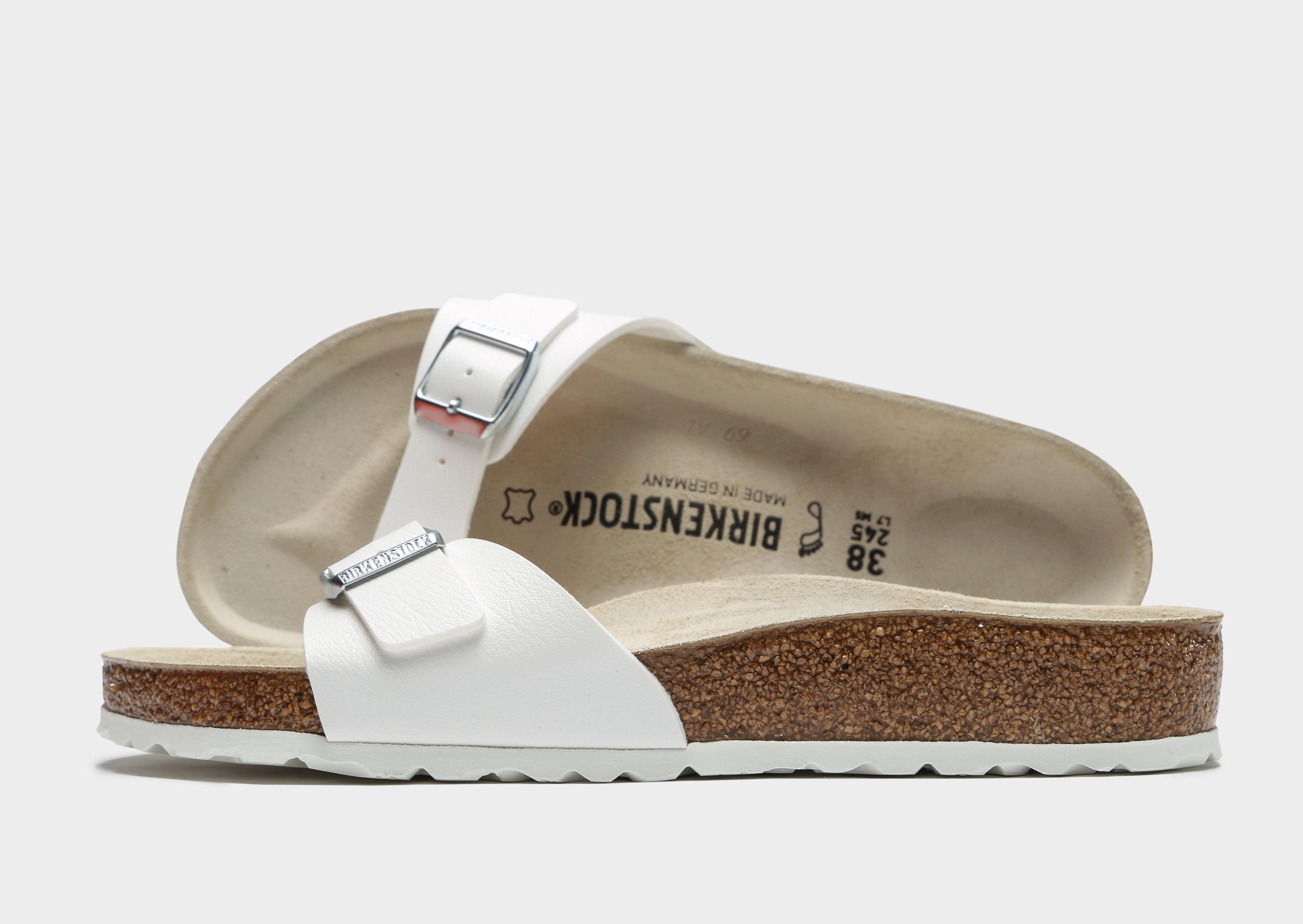 A summer essential for any wardrobe, these women's Madrid Sandals from Birkenstock are a classic go-to sandal. A contoured cork footbed is designed to mould to the shape of your foot and is complete with pronounced arch support, a deep heel cup, and a roomy toe box for luxury comfort that works with you. A lightweight EVA sole provides added cushioning and shock absorption whilst a durable synthetic white footstrap with a leather-like feel provides soft backing and flexibility. The sandal is finished with a soft suede lining and Birkenstock branding to the footbed and buckle. To make the most out of your pair, keep away from extreme heat.