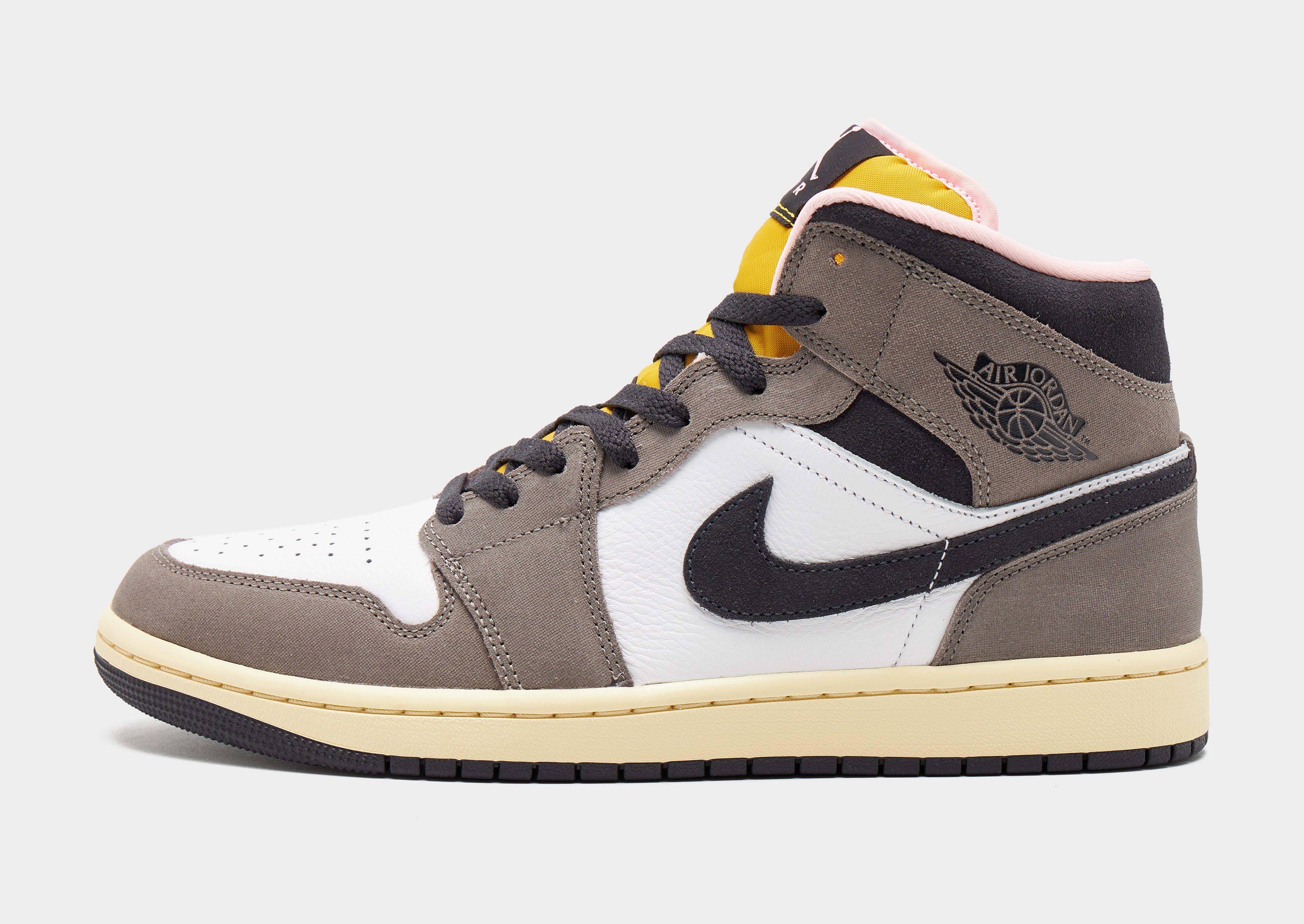 Keep your rotation iconic with the epitome of sneaker culture: the Air Jordan 1 Mid. Born from the collaboration between Nike and basketball legend Michael Jordan in 1985, the AJ1 changed the game forever, shattering conventions with bold colours and silhouettes. In a Grey colourway with Yellow details, these mid-top shoes are crafted from a leather, synthetic leather and textile blend across the upper for support. Underfoot, the foam midsole combines with Nike Air cushioning for lightweight comfort, while the durable rubber outsole has pivot circles for retro-inspired traction. With a padded ankle collar and perforations on the toe, these kicks are finished off with the Swoosh and Air Wings logo to the sidewalls and the iconic Jumpman to the tongue. Decades later, the AJ1 remains an icon of style and athleticism, transcending generations with its timeless design and legendary status. Style Code: HQ2011-100