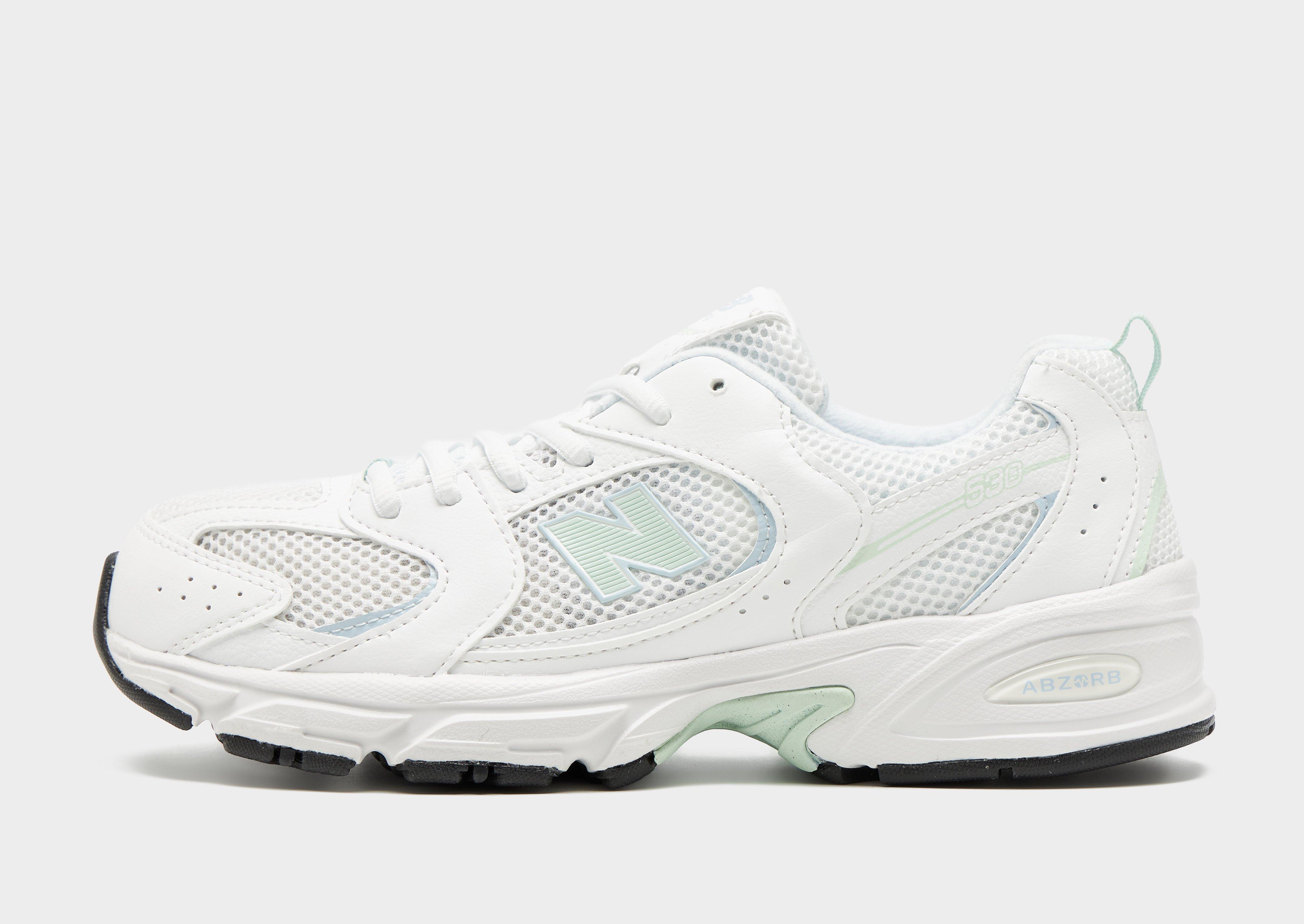 Bring retro running vibes to everyday rotation with the juniors' New Balance 530 trainers. Inspired by early 2000s performance style, these New Balance juniors' sneakers are built for school, weekends and everything in between. The breathable mesh upper with synthetic overlays keeps things lightweight, while ABZORB cushioning delivers all-day comfort underfoot. Finished in a white and mint colourway, they’re an easy match for any fit.
