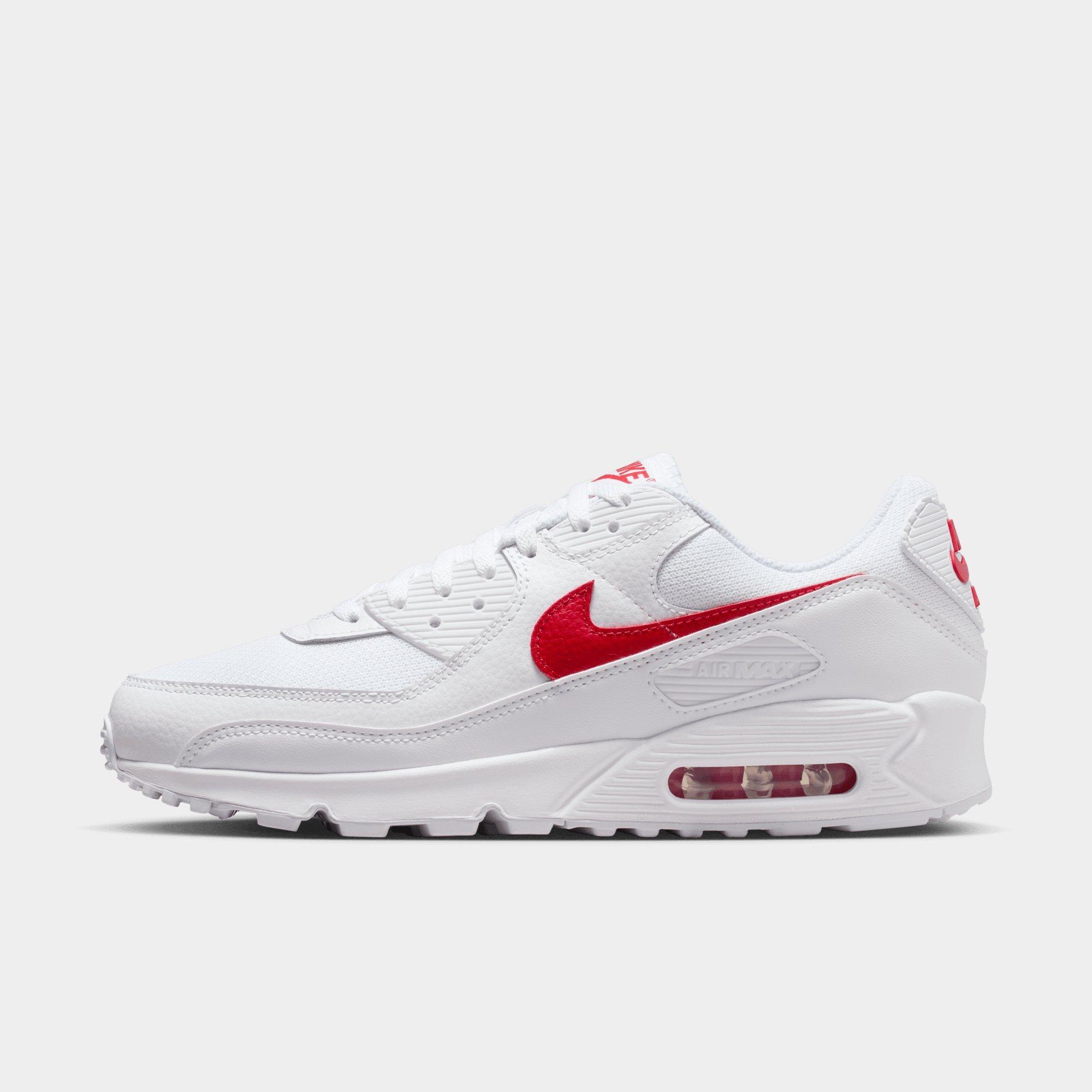 Giving Tinker Hatfield's '90 OG an upgrade, these men's Air Max 90 shoes from Nike are streetwear essentials. In a White colourway with Red details, these sneakers are built with a premium leather upper for supreme support. Keepin' the same design lines as the classic, a tonal lace-up fastening keeps you locked in and a lightweight midsole with a visible Air unit in the heel brings a smooth ride and essential cushioning. With a grippy rubber tread underfoot, these shoes are finished with Air Max branding and a Swoosh to the sidewalls. Style Code: DM0029-120
