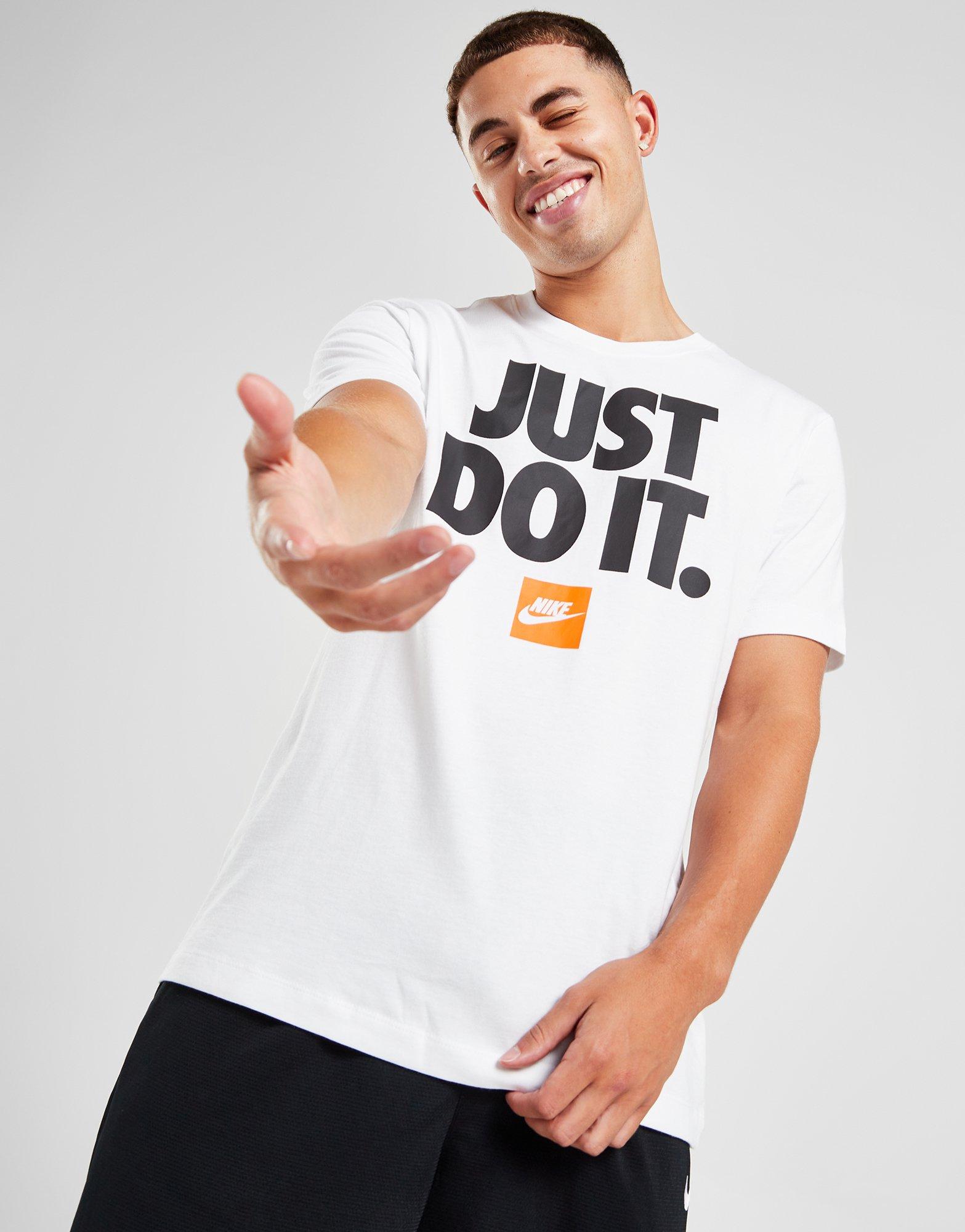 Level up your daily looks with this men's Just Do It Core T-Shirt from Nike. In a White colourway, this regular-fit tee is cut from soft, lightweight cotton for lasting comfort. It features a ribbed crew neckline and short sleeves for a classic cut, and is finished up with Nike's legendary 'Just Do It' slogan stamped to the chest. Machine washable. | Our model is 5'11" with a 38" chest and wears a size medium.